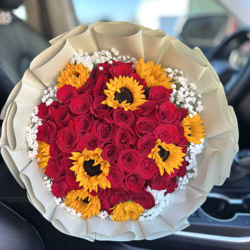 Price: $159.95 Bouquet With 50 Red Roses And Sunflowers Green Wrapping Paper Product Tags: Best seller Next-day Delivery